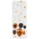 Glada Halloween-illustration med festballonger i svart och orange med en spöke, en häxa, en spindel och spindelnät och jack-o-lantern på vit bakgrund.