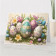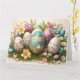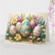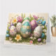 Gladskort för påsk med ägg arrangemang på säng av vårblommor. Pastellfärger.