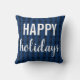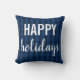 Glada helger kudde. Svarta och mörkgrå järnekblad på en mörkblå bakgrund i ett rutigt mönster. Glada helger är i vitt i två typsnitt. För en rustik men klassisk jul.