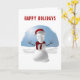 Glada helger-text som kan anpassas av dig. En rolig snöman med dödskalle-huvud som bär på Santa hatt och halsduk. Med en snöig bakgrund.