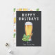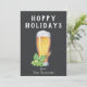 Målad ölbricka, humle och vete på svart skrivtavla med matchande mönster på baksidan i form av en pub, rolig "Hoppy Holidays"-kort.
