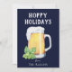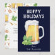 Målad ölmugg och klasar av humle på festlig blå bakgrund med matchande mönster på baksidan, roligt "Glada högtider"-kort.
