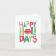 Skicka glada och ljusa högtidsönskningar med detta färgglada kort med roliga och lekfulla illustrationer som en del av ordet "glada högtider". Insidan har en plats för enkel hälsning i en matchande festlig rolig grön färg.