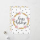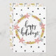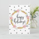 Detta moderna och festliga julkort är ett bra sätt att hålla kontakten under högtiden. Denna enkla design har en blomsterkrans med texten "glada högtider" på ena sidan. På andra sidan finns ett julpmyntmönster med en ramad tom yta för att skriva ditt eget meddelande.