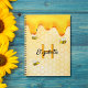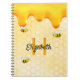 Gul, vit bakgrund med ett bikakemönster. Dekorerad med sött, gyllent drypande honung och glada humlor. Mallar för ditt namn och monogrambokstav. Perfekt för att förvara dina anteckningar när du arbetar hemifrån, dina sommarrecept eller trädgårds- och bakgårdsnoteringar.