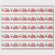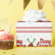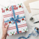 Glada Laxmas. Lacrossejulgåva som slår in papper. Glad Laxmas text med korsad lacrossepinnar och julstjärna. Snövitbakgrund med ljust - slösa snöflingor och röda randar.
