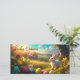 I en idyllisk, solbelyst dal sträcker sig ett pittoreskt vårlandskap med mjuka kullar och blommande träd. En strålande vit påskhare sitter uppmerksam i gräset, omgiven av färgglada, konstfullt dekorerade påskägg. Blommorna i livfulla färger och det varma gyllene ljuset från den nedgående solen ger scenen en fridfull och festlig atmosfär. Över scenen svävar den eleganta texten "Happy Easter", som understryker den festliga stämningen.
