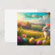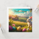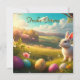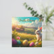 I en idyllisk, solbelyst dal sträcker sig en pittoresk vårlandskap med mjuka kullar och blommande träd. En strålande vit påskhare sitter uppmerksam i gräset, omgiven av färgglada, konstfullt dekorerade påskägg. Blommorna i livfulla färger och det varma gyllene ljuset från den nedgående solen ger scenen en fridfull och festlig atmosfär. Över scenen svävar den eleganta texten "Happy Easter", som understryker den festliga stämningen.