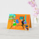 Denna anpassningsbara gratulationskort för glada retroföräldrar visar en mamma och pappa som jublar när deras barn springer iväg till skolbussen. Det firande paret befinner sig i sitt vardagsrum i 1960-talsstil, mid-century modern. Den orangea inredningen är allt annat än diskret. Det finns turkos, en konformad eldstad och en ljusblå äggstol mot en orange stenvägg. På väggen finns Mid Century Modern Globe Art, en utskrift på sträckt canvas, som finns tillgänglig i StrangeLittleOnions egen Zazzle-butik. På golvet finns en blå och svart bärbar skivspelare med flera vinylskivor utspridda i närheten. Pappa bär en svart kostym med en ljusblå skjorta och en mörkblå slips. Han visar upp sina bästa danssteg - de som skulle ge tonåringen ögonrullningar. Mamma bär en livlig grön klänning och en fladdrande vit förkläde med blå kant. Hon står framför skjutdörrar av glas och vinkar glatt när hennes barn springer nerför gången mot den väntande gula skolbussen. Genom dörrarna ser vi deras perfekt välvårdade, förortsliknande gräsmatta och den sedvanliga vita staketet. Till och med bakgrunden ser glad ut med en turkos himmel och silhuetter av cedrar. Insidan av kortet har