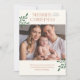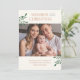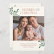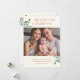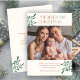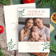 Vacker och fräsch julhälsningskort. Denna moderna och ungdomliga design har en uppsättning samtida teckensnitt, ett foto och anpassningsbar text på framsidan och baksidan av kortet. Bakgrunden både på framsidan och baksidan är vit med inslag av färsk ung grönska. Anpassa och personifiera för att göra det till ditt eget.