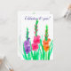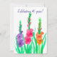 En blomsterlig bröllopsjubileum inbjudan dekorerad med tre livfulla gladiolus blommor i lila, rosa och orange med ljusgröna blad handmålade med akvarell. I blomspråket betyder Gladiolus "du genomborrar mitt hjärta" och karaktärsstyrka. Det är också den traditionella 40-års jubileumsblomman.