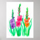 En blommigt poster dekorerad med tre vibrerande gladiolusblommor i lila, rosa och orange med ljust grönt löv hand som är målad med vattenfärg. På Blommor Gladiolus-språket elak "du tränger mitt hjärta" och karaktärsstyrka. Det är också den traditionella 40-årsblomman.