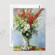 A vycard with the impressionist tavla, Bouquet of Gladiolus, Lilies & Daisys (1878), av Claude Monet (1840-1926). Ett stillastående livstidsband med vas på bord, med vit lilja, röd gladiolus och daisy.