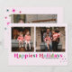 Det här helgdag innehåller texten Happiest Helgdagar i ljust helgdag färg, inklusive pinkar, , blues och gröntar, och en plats för två foton och din familj namn. Bakgrunden är en subtil rosa färg och det finns några gnistor längs kortets fram- och baksida. Baksidan har ett stort öppet område där du kan lägga till ett stort familjefoto!