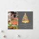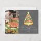 Illustration av julgran formad pizzaslice med stjärnor. Bakgrunden är inspirerad av en svart taffel. Anpassa namnet, året och fotot.
