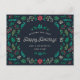 Denna design visar en festlig krans gjord av järnek, bär och olika vinterväxter. Den kraftiga grönskan och röda accenterna framträder mot en mörk bakgrund och omger ett hjärtligt budskap om julglädje och önskningar om ett underbart nytt år.