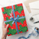 En grön karta av Texas, visning dess län, sitter på en röd bakgrund amid pastell färgad snöflingor. Rolig jul som annars slår in papper för någon stolt Texan eller någon vem älskar Texas.