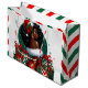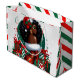 Glam jul Gift Bag | Afrocentric Helgdag Stil | Red & Grönt Luxury Design firar årstiden med den här julklappen i chicen med en glamorös, prisande design med en glamorös svart kvinna med stora kurvor, med en strålande röd och grönt rand med vit päls-trim. Hon har tillgång till en festive Santa-hatt med holly, djärv guld ring-örhängen och en sjudande grönt. Bakgrunden innehåller snöflingor, dekorationer och vackert inslagna presentkartonger i rött, grönt och vitt, skapande en helgdag av elegant. Perfekt för julfester, unika gåvor och spridande av fessionsjort!