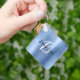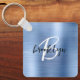 This elegant personalized keychain features a monogram and first name in modern black and white script on a glam blue faux brushed metal background.