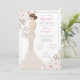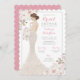 Den glamorösa inbjudningskort för möhippan har en brud i en glatt, snöre sjöjungfru bröllop, med vattenfärgade blommor i rosa och vitt. Det finns flera alternativ för bridans hår- och hudfärg.