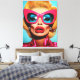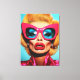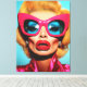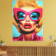 En slående, hög mode-porträtt av en glamorös diva med omfångsrika blonda hår, överdimensionerade solglasögon av shock rosa-katt-öga, fet rött läppar och elblåögd. Det ser häftigt ut, retro, och opassande fantastiskt fantastiskt - en popkonsdröm i levande färg.