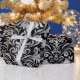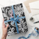 Denna elegant som slår in papper, göras upp av en damastast design i fauxsilver omkullkastar, på en mörk svart bakgrund. Ett dramatiskt, glamoröst söker efter dina gåvor! Please noterar att designen skrivs digitalt på ut och det slående in papperet inte innehåller faktiskt silver omkullkastar.