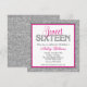 En modern inbjudan till födelsedagsfest för sextonåring. Med en falsk silverglitterdesign med inslag av varmt rosa och svart. Designen är platt tryckt grafik - INTE FAKTISKT GLITTER.