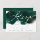 Elegant och glamouröst bröllopssvarskort med vattenfärgseffekten i smaragdgrön färg med falskt guldglitter. Det finns ett handskrivet vitt skript som säger "RSVP" högst upp. Detta typografidesignkort listar också maträttsvalen för gästerna att välja mellan. Perfekt för ett höst- eller vinterbröllop.