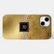Glam guld-ton iphone case, med grafik av ett guld-dammmönster, över överkanten och en guld-folie som ser ut över grund vid fodral. Faux diamantstranden springa över fodral mitten och fylls av med en svart och guld fyrkantig plack. Anpassa monogrammet för brev till kostym efter dina behov.