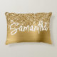 Anpassa teckensnittet färg, stil och storlekt efter behov. Det finns flera fet, modern, penselskriptkalligrafi-typsnitt tillgängliga. Bakgrunden är stor faux guld glitter och faux golden gult borstad metall foil. Den giglila glam från glitter skriver ut som ett foto på den här dekorativa dekorativa dekorationskudden.