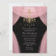 Glam Quinceanera-födelsedagsinbjudan i svart, med grafik av rosa genomskinliga gardiner som ramar in inbjudan, med en gyllene ljuskrona och gnistrande stjärnor. Anpassa den anpassade rosa texten för din dotters speciella födelsedag.