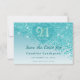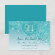 Step into your twenties with a touch of modern glamor. This 21st birthday “Save the Date” features a dazzling cascading teal blue glitter gradient, and a sophisticated “frosted glass” heart-shaped emblem. The front showcases a majestic gold-rimmed “21st” logo, centered within the heart, paired with refined Baskerville, and elegant script typography.