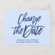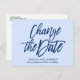 Elegant vit marmorerad och glitter Bröllopsförsening eller datumändring med en trendig typsnittsbokstav som säger "Ändra datum" i trendigt glitter skimrande blått på en glamourös blekblå bakgrund. För anpassad förfrågan, vänligen skriv till citronelladesign@gmail.com