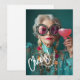 Bilden innehåller en äldre snyggt som är adorterad i feta, överdimensionerade smycken, inklusive stora pärlor och vibrerande gemen. Hon har stora, runda solglasögon som är utsmyckade med rhinestoner, och hennes ljusröda läppstift kompletterar hennes glamorösa utseende. Hennes chic är en turkos snöre ensemble, och hon har en rosa cocktail i ett känsligt glas, som utstrålar elegans och karisma.