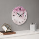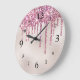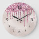 Den här glamorösa och gigantiska väggklockan har en elegant, rosa glitter och champagnepärlfolie. Smaklig faux rosa glitter droppar över klockans övre del. Bakgrunden är glam, champagne färgad, faux foil pearl mönster. Siffrorna skrivs ut med ett tydligt svart teckensnitt.
