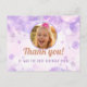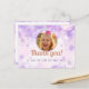 Uttryck tacksamhet efter en magisk födelsedagsfirande med detta tack-kort! Det har ett vackert personligt foto av ditt barn, omgivet av drömlika lila akvarellbubblor och glittrande silverstjärnor. Denna fantasifulla design är perfekt för en flickas födelsedagsfest, och får gästerna att känna sig uppskattade för deras närvaro och gåvor. Anpassa enkelt med ditt eget foto och meddelande för att skapa en minnesvärd souvenir. Ett verkligt speciellt sätt att säga "tack" för den bästa födelsedagen någonsin!
