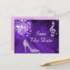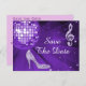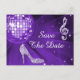 Eleganta, glamourösa 18-årsdag / artonde födelsedag sparar datum postkort. Trendiga glitter och glamour Spara datum för din 18-års / artonde födelsedagsfirande. Vacker, strålande lila/lilafärgad/lavendel glänsande diamanter bling juveler musiknotbild, funky lila/lilafärgad/lavendel retro diskoklot och lila/lilafärgad/lavendel glitter stiletto högklackad modere sko bild på en chic lilafärgad bakgrund. Ett sött, klassiskt, fashionabelt, stilrent, vackert sparar datum postkort för kvinnors födelsedagsfester. Kvinnor kommer att älska denna coola, roliga, funky, flickiga design för deras glamourösa musik- och dansfester. Om
