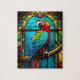 Konstruktion för fastnat glas med ett rött, brunt, grönt, orange och turkofönster. I förgrunden, en lakaw sitta på en perch. Makan har royal blå, akva, gult, grönt och röda fjädrar.