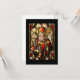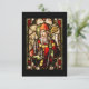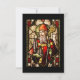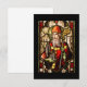 Bild av den irländska helgon som håller en shepherds-krok och bär en biskop-hatt och rob. Bakgrunden har en mängd färger och blomningsfärger.
