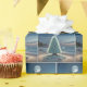 Ett havsglas Julgran står på stranden under det ljusa fullt måne, med stjärnor som blinkar på natten himmel som en skonsam vinkar krasch mot stranden