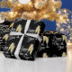 Denna pappra förpackning innehåller två glas champagne, färggranat konfekt och texten: Gott nytt år.