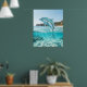 A graceful glass dolphin arcs through a sparkling tropical lagoon, its sleek body formed from transparent crystal with flowing contours, refracted light, and subtle aqua tinting. Sculpted fins and polished surfaces capture movement, joy, and ocean elegance. Turquoise water, coral shadows, pale sands, bright sunlight, and distant cliffs create a fresh uplifting coastal scene filled with brilliance. Perfect for beach homes, bathrooms, spa décor, nurseries, and anyone who loves dolphins, marine life, and serene premium wall art.