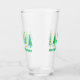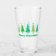 En modern geometrisk design av fem granträd i kricka, turkos och guld- gult. Den läser "god jul", i att matcha grön text.