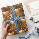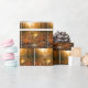 A glass of white wine rests among fallen autumn leaves in a sunlit forest, with the warm glow of the setting sun enhancing the golden hues of the scene