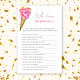 Denna bröllopsdusch med glass-tema är dekorerad med akvarellblommor och en glasskon. Texten lyder "She's been scooped up!" i stilfull rosa script-typografi. Akvarell-glass med blommor och frukter.
