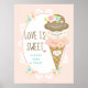 En söt och charmig glass-tema skylt med texten "Love Is Sweet Please Take A Treat" med en vattenfärgseffekt med blom- och rosaccent i bleka blå och persikorosa nyanser och en glass-strut med tre kulor i neapolitanska smaker av jordgubb-, vanilj- och chokladglass med strössel på. Bruden och gästerna kommer att bli förtjusta i denna shabby chic vintage-inspirerade design med en inramad fjäder-spets kant och rosa prickmönster. Konst och design © Chrissy H. Studios, LLC. Med ensamrätt. Konst © Chrissy H. Studios, LLC. Med ensamrätt.