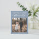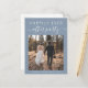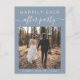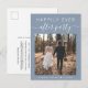 Dammblå förlovnings- eller mindre bröllopsinbjudan och mottagningsinbjudan postkort. Framsidan visar er bröllopsdagsfoto och "Glatt Efterfest" i en blandning av modern vit typografi och ett trendigt vitt skrivsätt med svängar. Under er bild kan ni lägga till era förnamn och bröllopsdatum. På baksidan kan ni anpassa ert meddelande och lägga till fest- eller mottagningsdetaljer och era namn i ett signaturliknande skrivsätt.