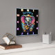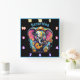En livfull elefant med hatt som strum en gitarr, omgiven av lekfull, färglös mönster som framkallar en festlig atmosfär, som fångar stollig och kreativitet.