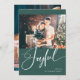 Julkortet i elegant säger "Glatt" i den moderna helgdag för manuskalligrafi. Lägg till två av dina favoritfoton i familjen och ditt namn. Bakgrunden är en festlig grönt färg.