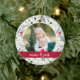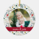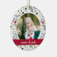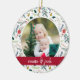 Festiv fotojulprydnad har ett favoritfoto på vardera sidan, inramat av ett helgdag botaniskt mönster. Anpassa med en anpassningsbar på vardera sidan som visas med namn i handskrivet skript och året på motsatt sida. Koordinerar vår Glatta typsamling för helgdag.